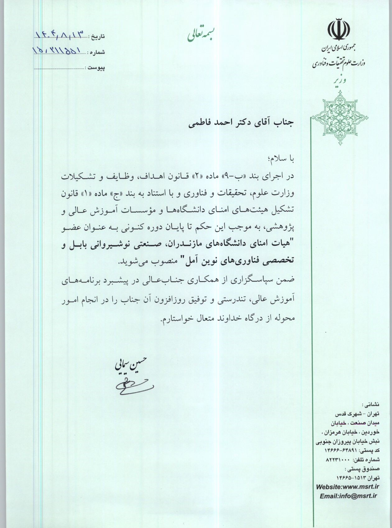 بر اساس این گزارش، وزیر علوم بر اساس بند"ج" ماده"1" قانون تشکیل هیات امنای دانشگاهها، موسسات آموزش عالی و پژوهشی، دکتر احمد فاطمی نماینده مردم بابل در مجلس شورای اسلامی را بهعنوان عضو حقیقی جدید هیات امنای دانشگاههای مازندران، صنعتی نوشیروانی بابل و تخصصی فناوریهای نوین آمل تا پایان دوره کنونی منصوب کرد.